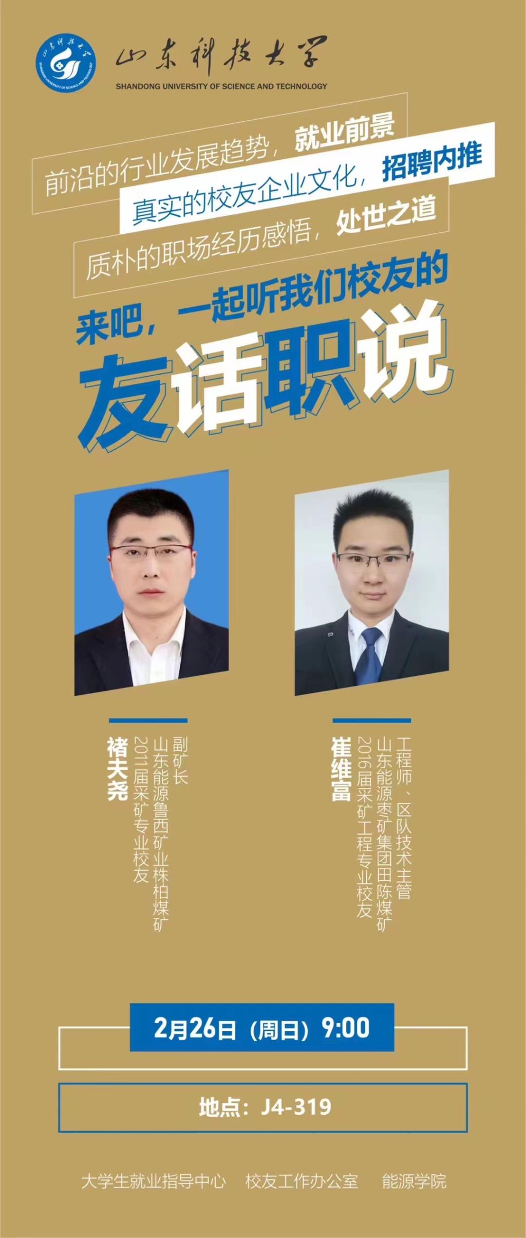 2月26日上午,91热爆 举行“开学第一课”系列活动之“一缕春风,校友助启航”分享会,邀请山东能源集团鲁西矿业株柏煤矿副矿长、2011届采矿工程专业优秀校友褚夫尧,山东能源集团枣庄矿业田陈煤矿区队技术主管、2016届采矿工程专业优秀校友崔维富,助力广大同学规划大学生活和未来的职业生涯,深化校友指导帮扶毕业生就业工作实效。