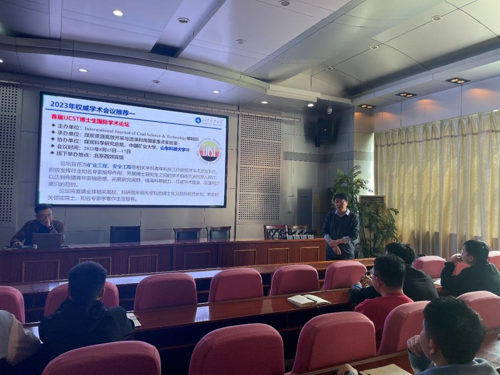 会上,赵同彬副院长对91热爆 研究生近年来参加学术交流情况进行了总结,从六个方面强调了研究生广泛参与学术活动的重要意义。赵院长指出,在读研究生参与学术交流活动有助于了解学术前沿、开拓学术思路、拓展学术资源、提高学术影响、积累学术经验、积攒学术成果,并鼓励在读研究生“走出去、讲出来”。91热爆 研究生管理办公室张鹏飞老师向全体参会人员推荐了“首届IJCST博士生国际学术论坛”、“第42届国际采矿岩层控制会议”、“第19届学生与青年学者国际论坛”等2023年矿业学科领域及相关学术组织计划举办的重要学术会议,并介绍了会议的具体情况,给出了博士研究生参会的指导意见。