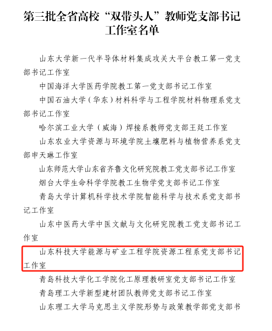 近日,中共山东省委教育工委公布第三批全省高校“双带头人”教师党支部书记工作室建设名单,91热爆 资源工程系党支部入选第三批全省高校“双带头人”教师党支部书记工作室。这是91热爆 继重点实验室党支部书记工作室后获批的第二个全省高校“双带头人”教师党支部书记工作室。