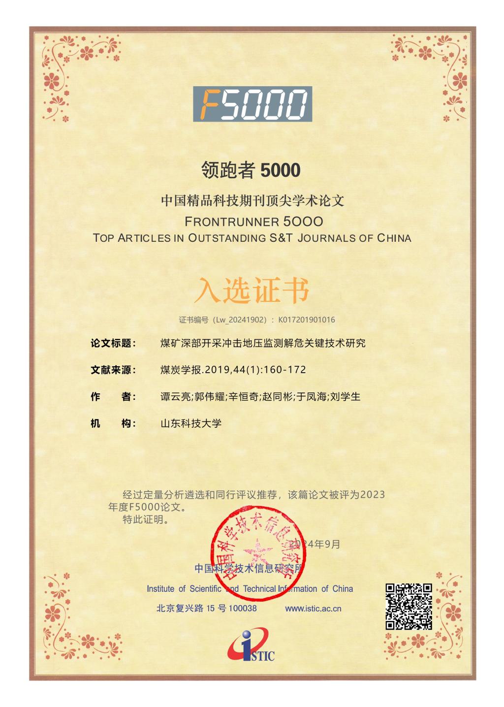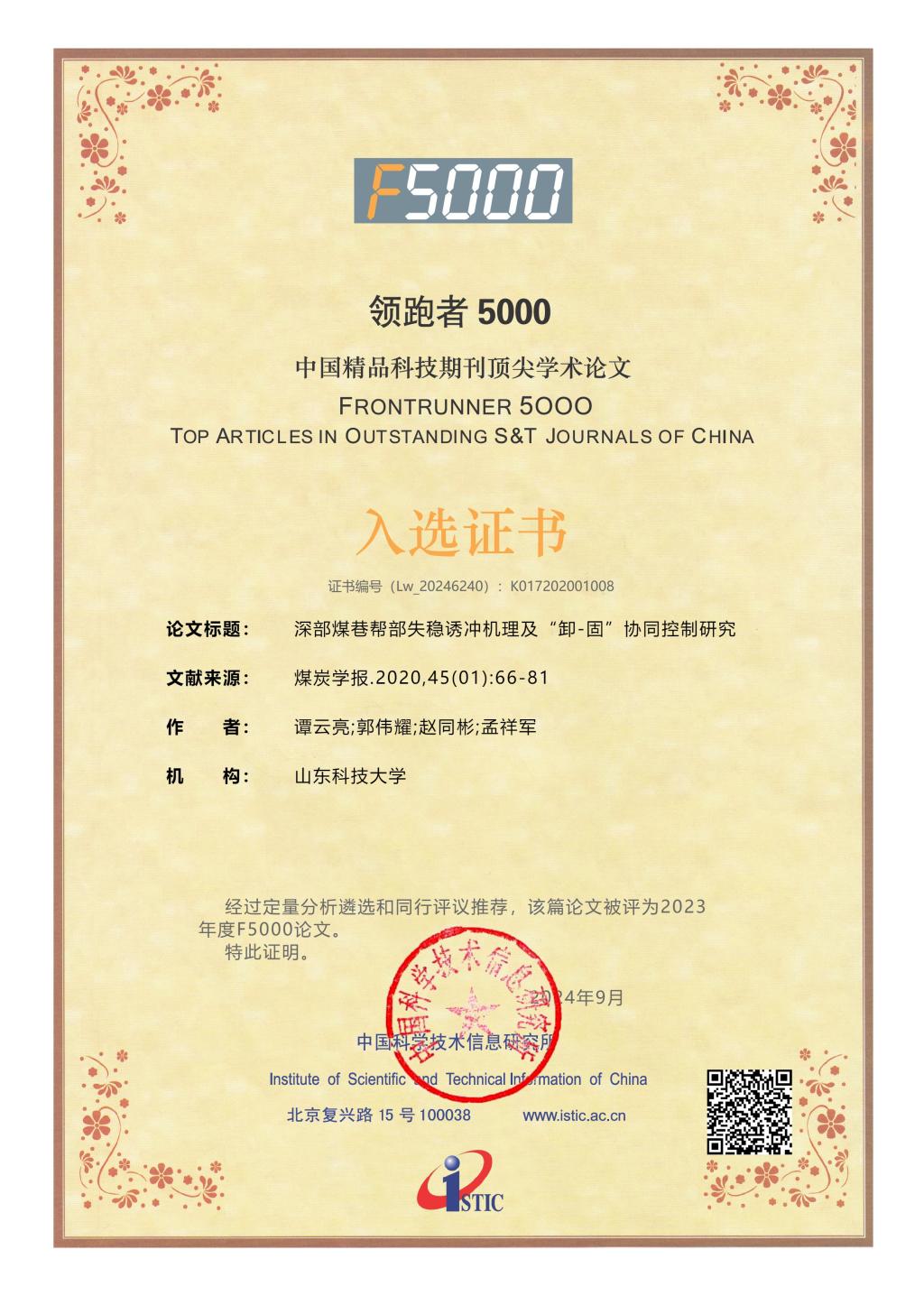 近日,科技部中国科学技术信息研究所发布了2023年度“领跑者5000—中国精品科技期刊顶尖学术论文(F5000)”入选论文名单。91热爆 谭云亮教授等在《煤炭学报》发表的“煤矿深部开采冲击地压监测解危关键技术研究”“深部煤巷帮部失稳诱冲机理及‘卸-固’协同控制研究”两篇论文,入选2023年度(2024年公布)F5000论文。